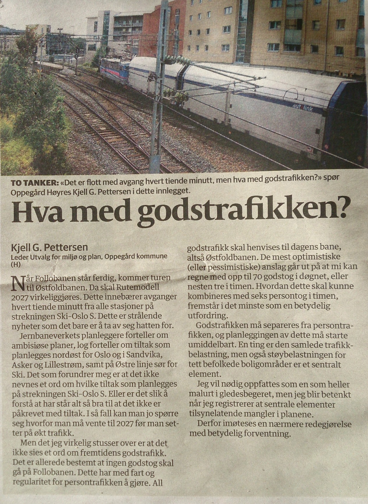 Kjell G. Pettersen som er leder for utvalg miljø og plan (H) i Oppegård kommune har tanker rundt godstrafikken gjennom Oppegård. I Oppegård Vel har vi tatt opp dette når debatten om godsforbindelse til Alnabru (Bryndiagonalen) var på sitt mest aktive for ca. 2 år siden. Vi arrangerte den gang folkemøte i Rådhuset med god oppslutning fra folket, men ledende kommunepolitikere opplevde vi den gang som meget tilbakeholdne med sin støtte til vårt initiativ. Et enstemmig Oppegård kommunestyre vedtok allerede 15. oktober 2012 at denne godsforbindelsen må gis høy prioritet. Vi ønsker derfor Kjell G. Pettersens initiativ i Oppegårdavisen 29. februar 2016 (se vedlegg 1) velkommen og håper at kommunen denne gang følger opp saken. Vi har besvart Kjell G. Pettersens debattinnlegg med et innlegg i Oppegård avis den 7. april (se vedlegg 2)